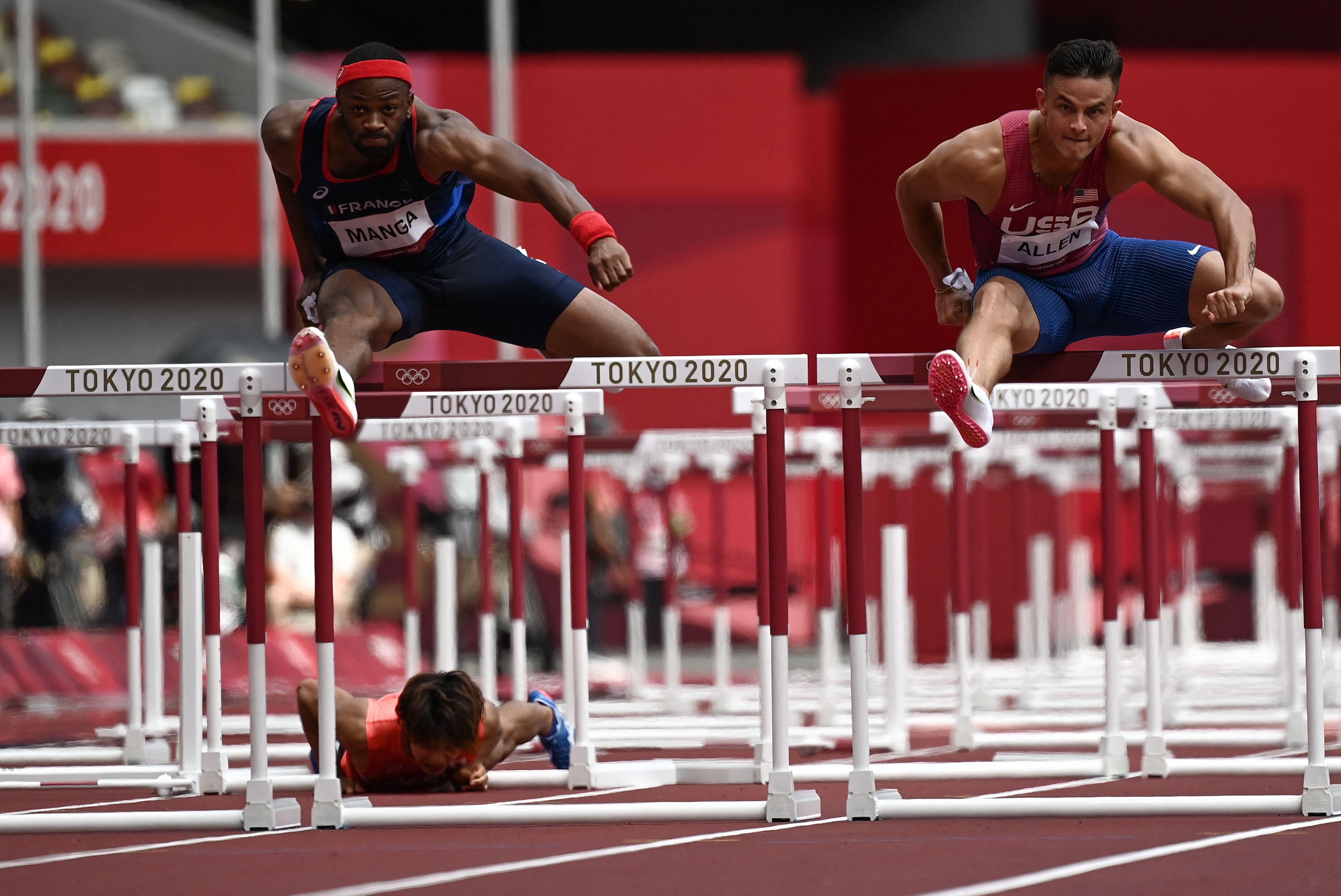 American Devon Allen (R) wins ahead of France's Aurel Manga (L) and Japan's Taio Kanai, who fell in the men's 110m hurdles semifinals at the Olympic Stadium on Aug. 4. Photo: Jewel Samad/AFP via Getty Images