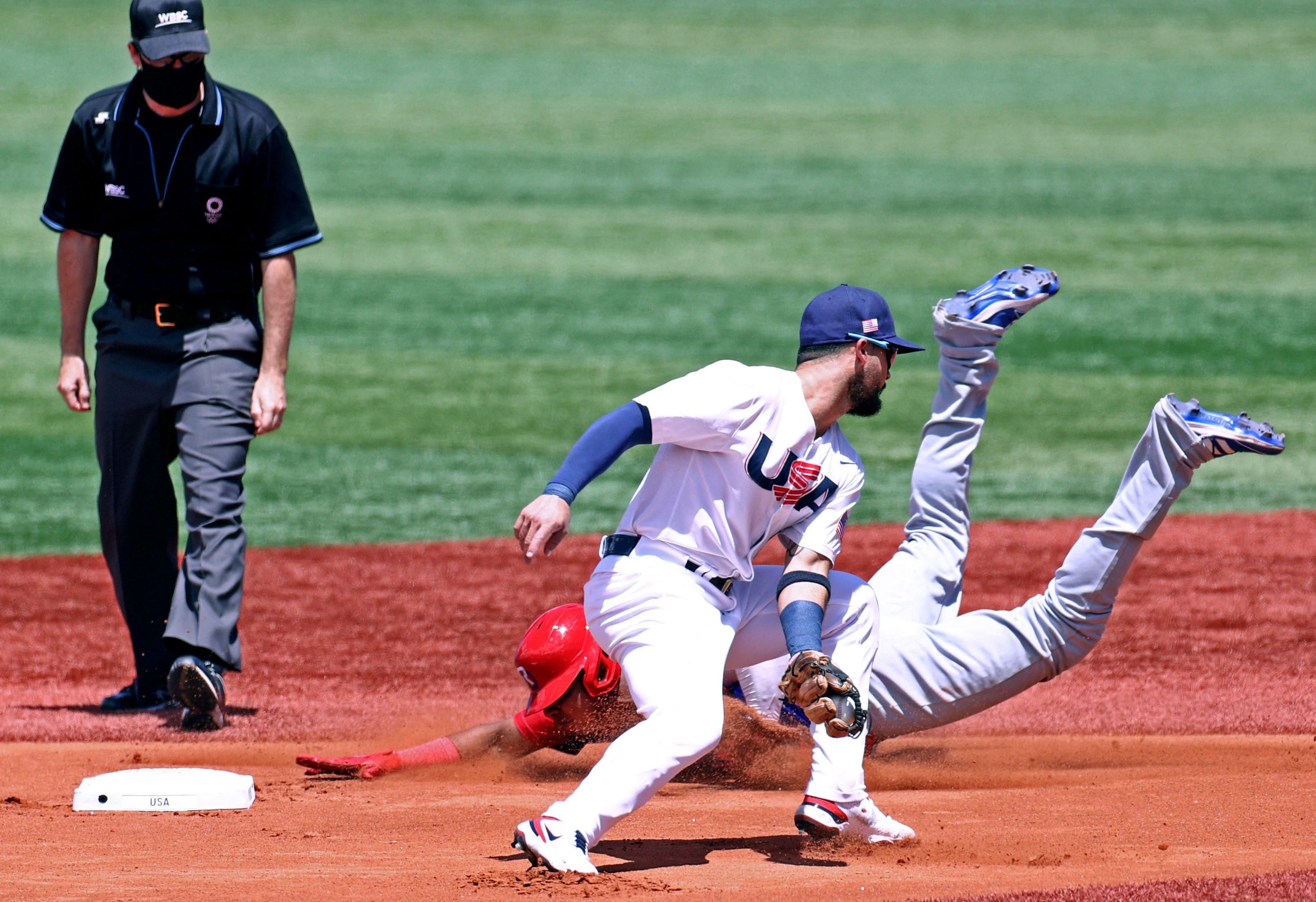 Dominican Republic's Erick Mejia (rear C) dives safely into second base for a double as Team USA's second baseman Eduardo Alvarez (front C) catches the ball during the first inning of their baseball round 2 game at Yokohama Baseball Stadium in Yokohama on Aug. 4. Team USA beat the Dominican Republic 3-1 to advance to the semifinal. Photo: Kazuhiro Fujihara/AFP via Getty Images