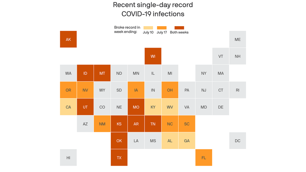19 states this week set new highs for coronavirus infections recorded in a single day, according to the COVID Tracking Project and state health departments. 11 states surpassed records set just last week.