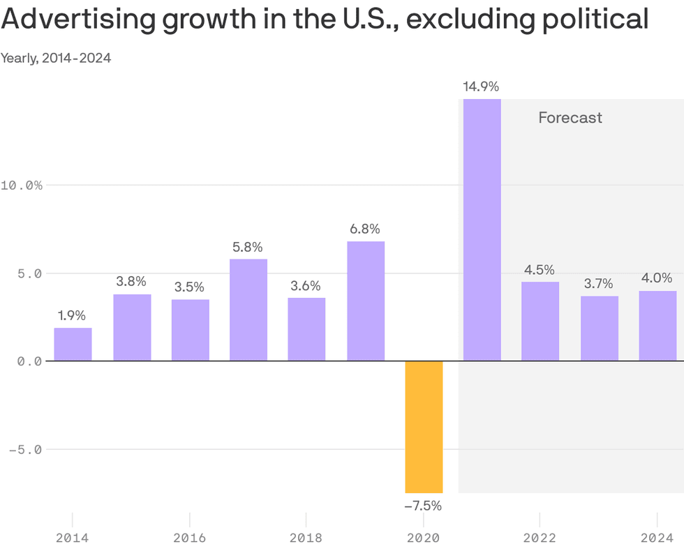 Between the lines: Beyond the general economic recovery, analysts are also optimistic that in-person activities, like sporting events, live entertainment and travel, will return faster-than-expected, driving marketing opportunities.