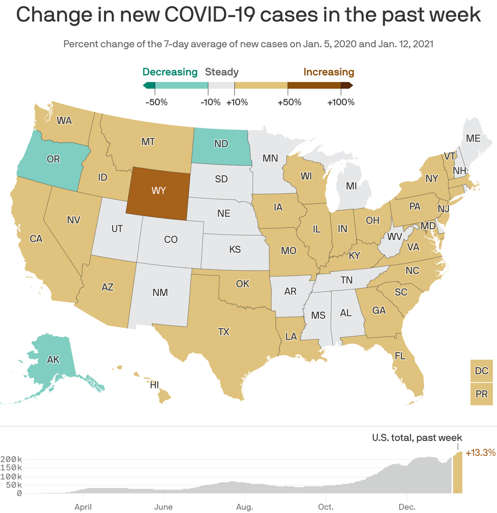How it works: Each week, Axios tracks the change in new infections in each state. We use a seven-day average to minimize the effects of day-to-day discrepancies in states’ reporting.