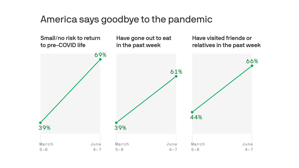 In a very short time, Americans have returned to doing the things many haven't done in a long time — and now see less risk than ever in returning to their pre-pandemic lives, according to the latest installment of the Axios/Ipsos Coronavirus Index.