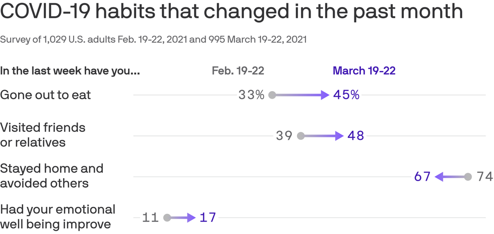With each shot in the arm, more and more Americans are letting down their guard — seeing family and friends outside the home again, venturing out to eat or relaxing social distancing precautions, according to the latest installment of the Axios/Ipsos Coronavirus Index.