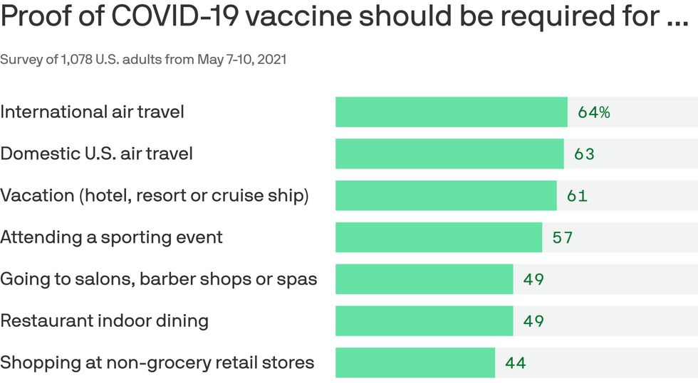 The intrigue: Americans are divided over whether and when they should have to show proof of vaccination.