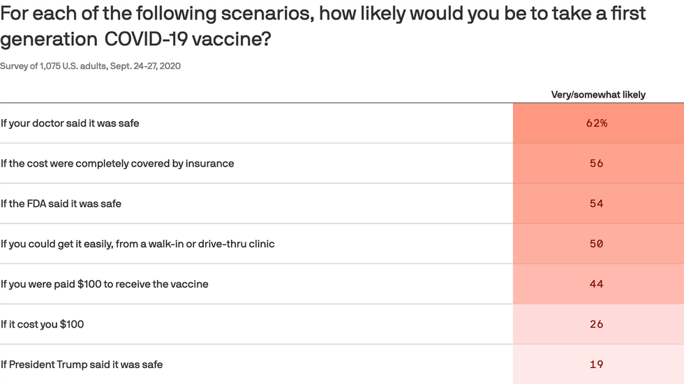 Barely two in 10 Americans would take a first-generation coronavirus vaccine if President Trump told them it was safe — one of several new measures of his sinking credibility in the latest wave of the Axios-Ipsos Coronavirus Index.