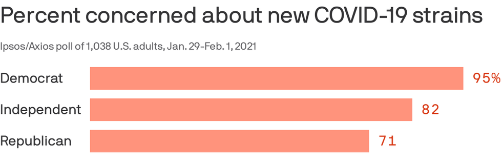 - Concerns about new strains of coronavirus are far more bipartisan: 95% of Democrats, 82% of independents and 71% of Republicans.