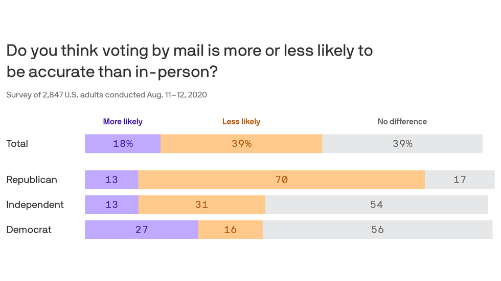 Why it matters: As President Trump seeks to delegitimize absentee voting and politicize the U.S. Postal Service, the findings in this national survey document the potential for wide voter disenfranchisement or mistrust in the results come November.