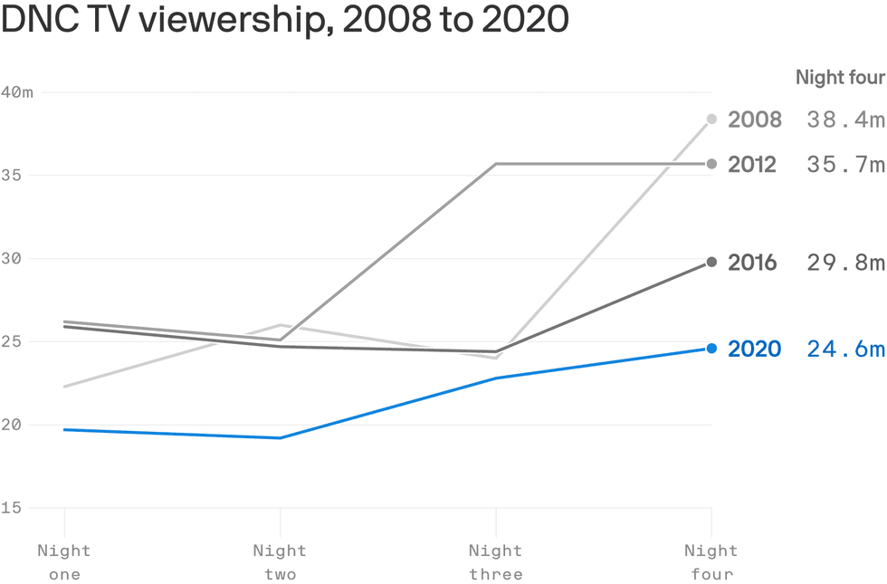 The big picture: Viewership for the Democratic National Convention was down about 25% on average this year compared to 2016.