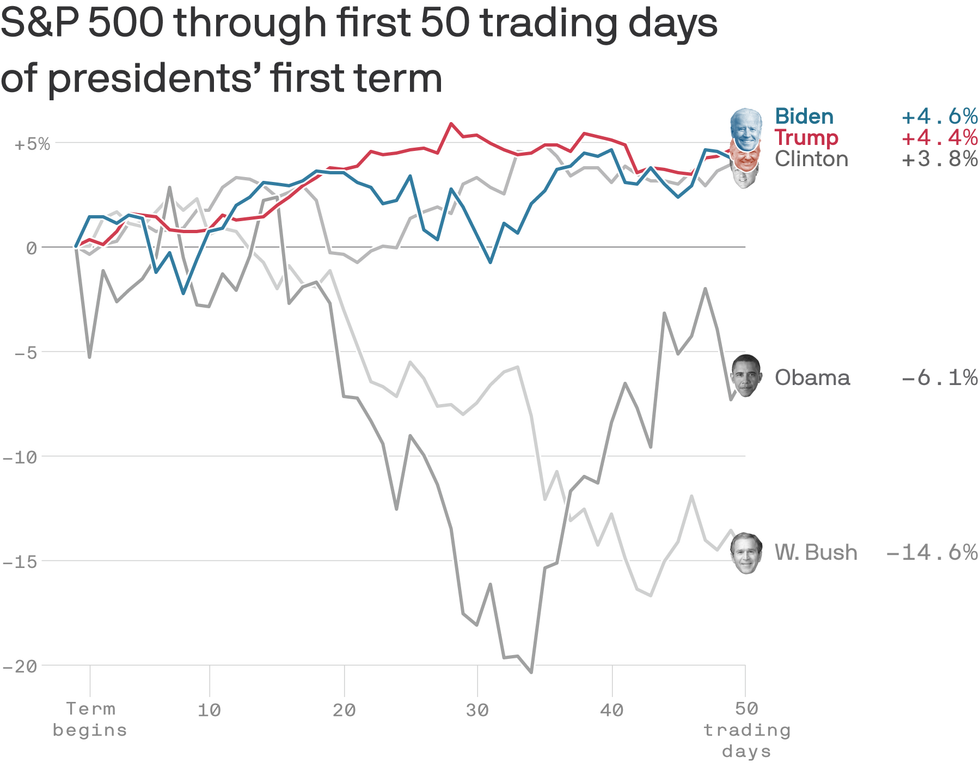 By the numbers: The S&P 500 increased by 4.6% during the first 50 trading days of the Biden presidency, from market close on Jan. 19 to market close on March 31. Trump's first 5-day bump was 4.4%, whereas President Obama was down 6.1%.