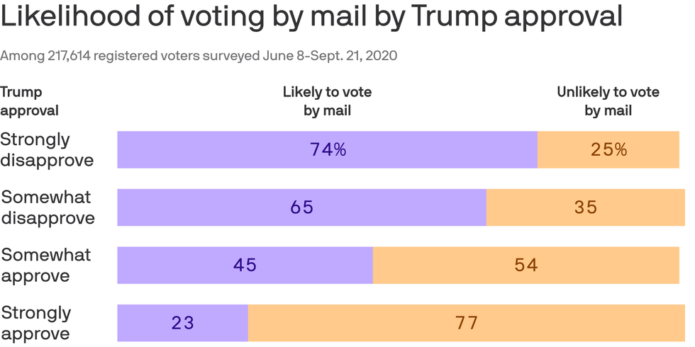 Voters who disapprove of President Trump most strongly are by far the most likely to vote by mail in the presidential election, according to an Axios analysis of exclusive data from SurveyMonkey and Tableau.