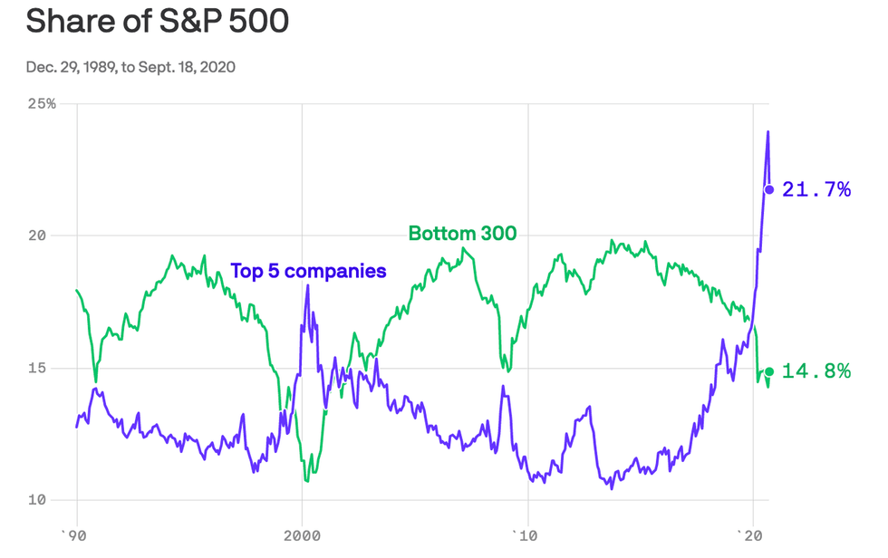 - In August, five companies — Apple, Microsoft, Amazon, Facebook and Alphabet — held a share of the S&P 500 that was 9% greater by market cap than the index's 300 smallest companies. This was a record amount.