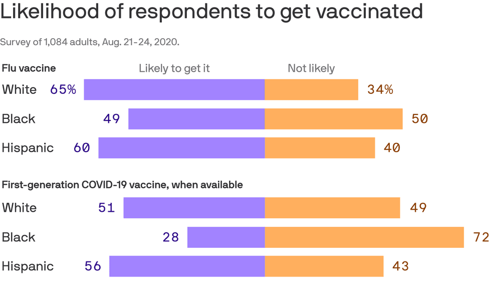 Black Americans are less likely than white Americans to say they plan to get a flu vaccine this year, and significantly less likely to say they'll take a first-generation coronavirus vaccine, according to numbers from the latest edition of the Axios-Ipsos Coronavirus Index.