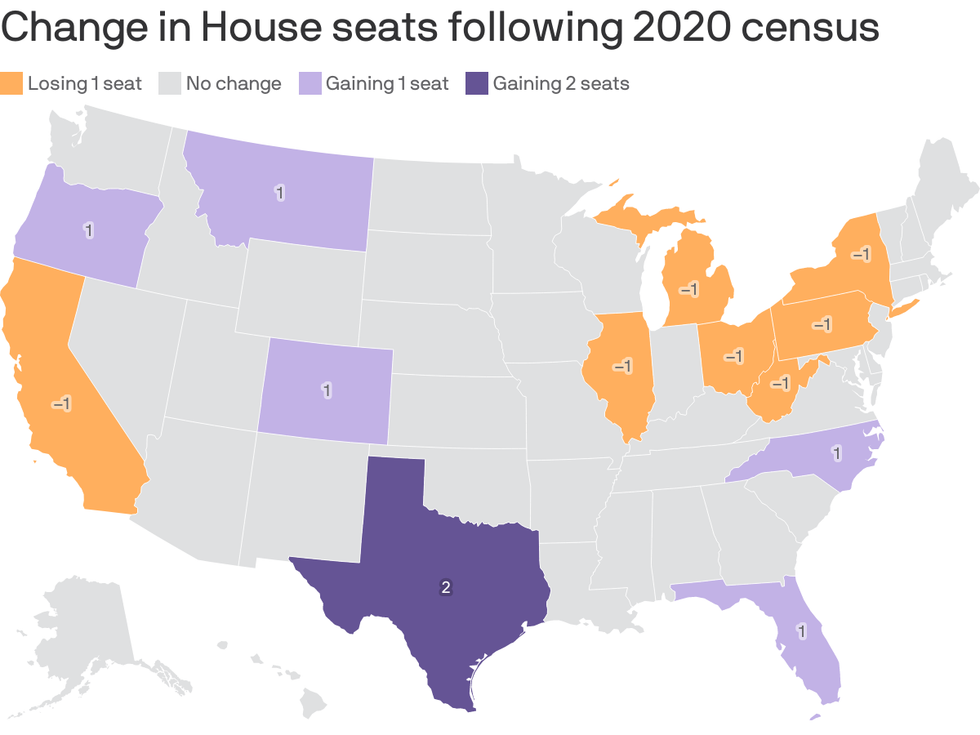 The bottom line: "Reapportionment itself means little compared to the redistricting fights to come," Wasserman told Axios. "The bigger shift in House seats are likely to come from how districts are drawn, not how many districts each state gets."