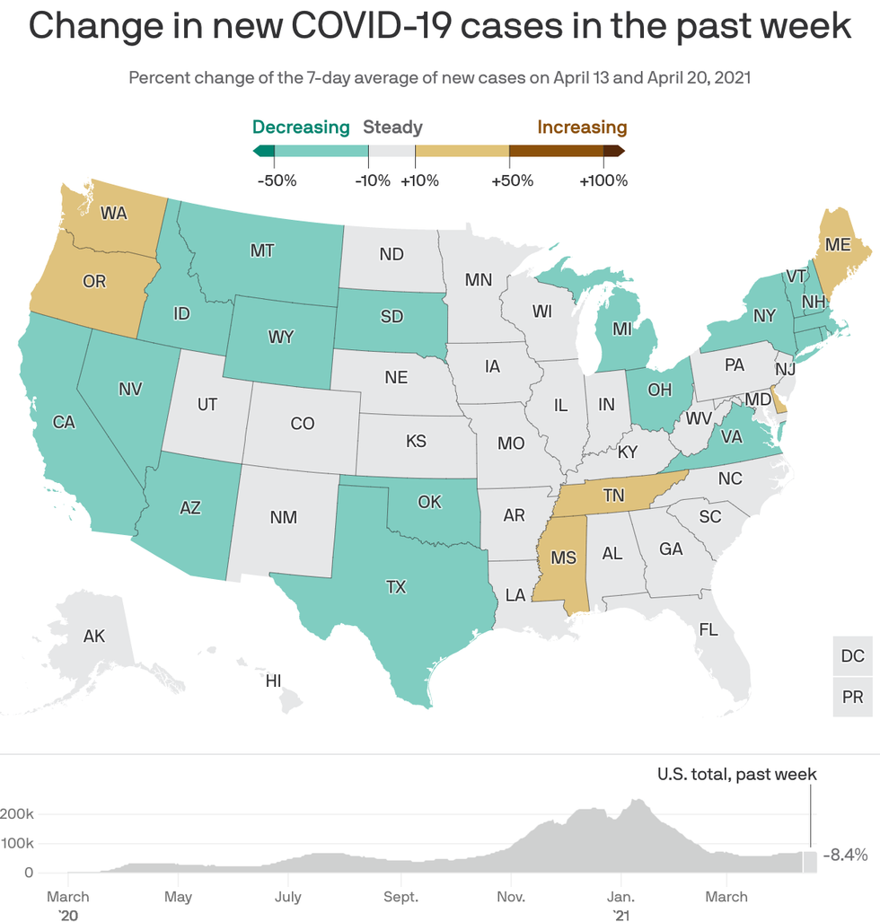 Where it stands: In the last week of February, the U.S. was averaging 65,686 new coronavirus cases per day. Now, eight weeks later, we’re averaging 64,814 new cases per day.