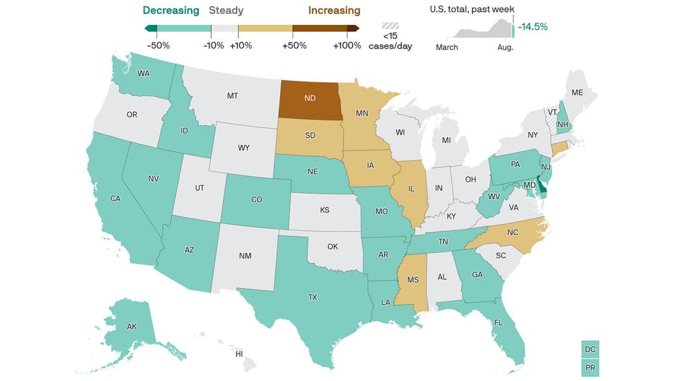 - A handful of states across the South and Midwest headed in the wrong direction this week, as did Massachusetts, which was hit hard at the beginning of the pandemic but has since managed to keep the virus reasonably well contained.