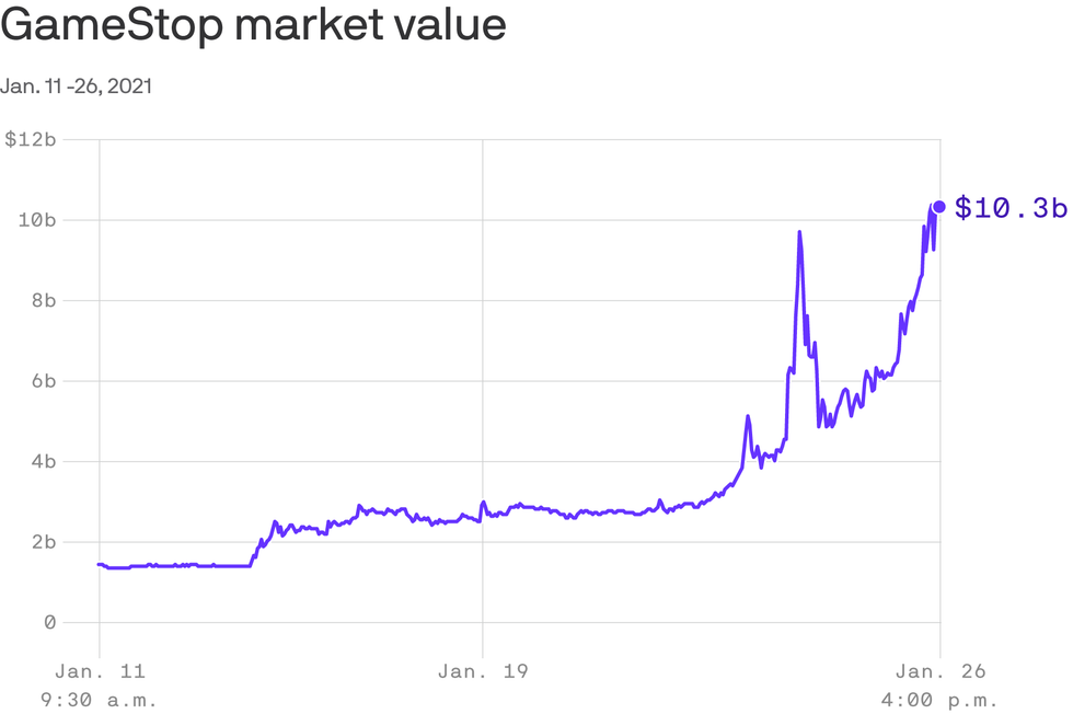 Driving the news: The market value of GameStop closed at more than $10 billion on Tuesday, on record volume of more than $26 billion.
