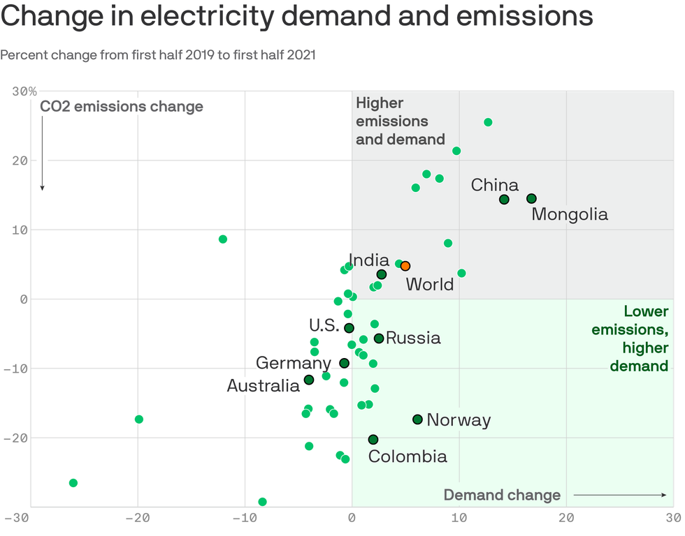 The big picture: Global power sector emissions bounced back strongly from lows seen during the first half of 2020 to reach about 5% higher than the first half of 2019, the report finds.