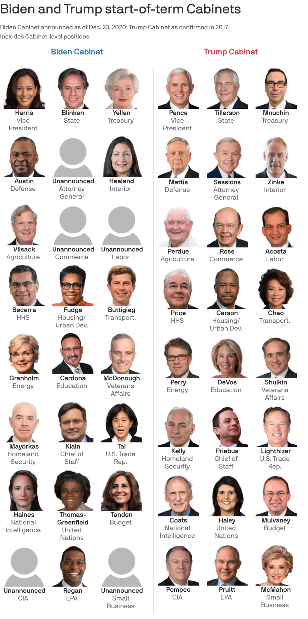 Go deeper: Bios of Biden nominees and appointees; Trump's 2020 Cabinet.