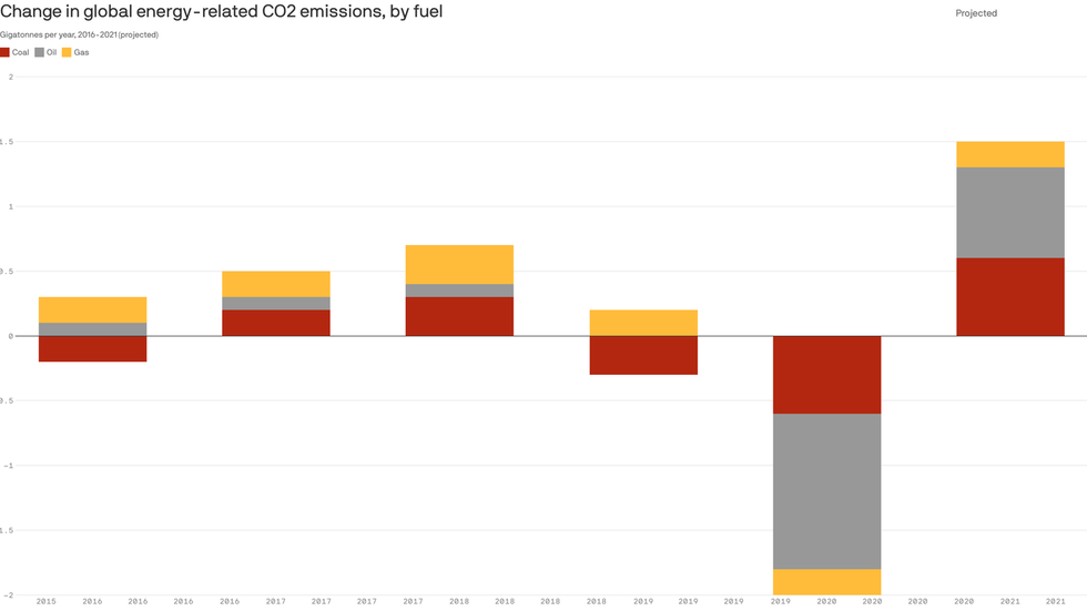 Why it matters: The projected rise of nearly 5% would be the largest since the "carbon intensive" recovery from the financial crisis over a decade ago, IEA said, putting emissions just below their 2019 peak.