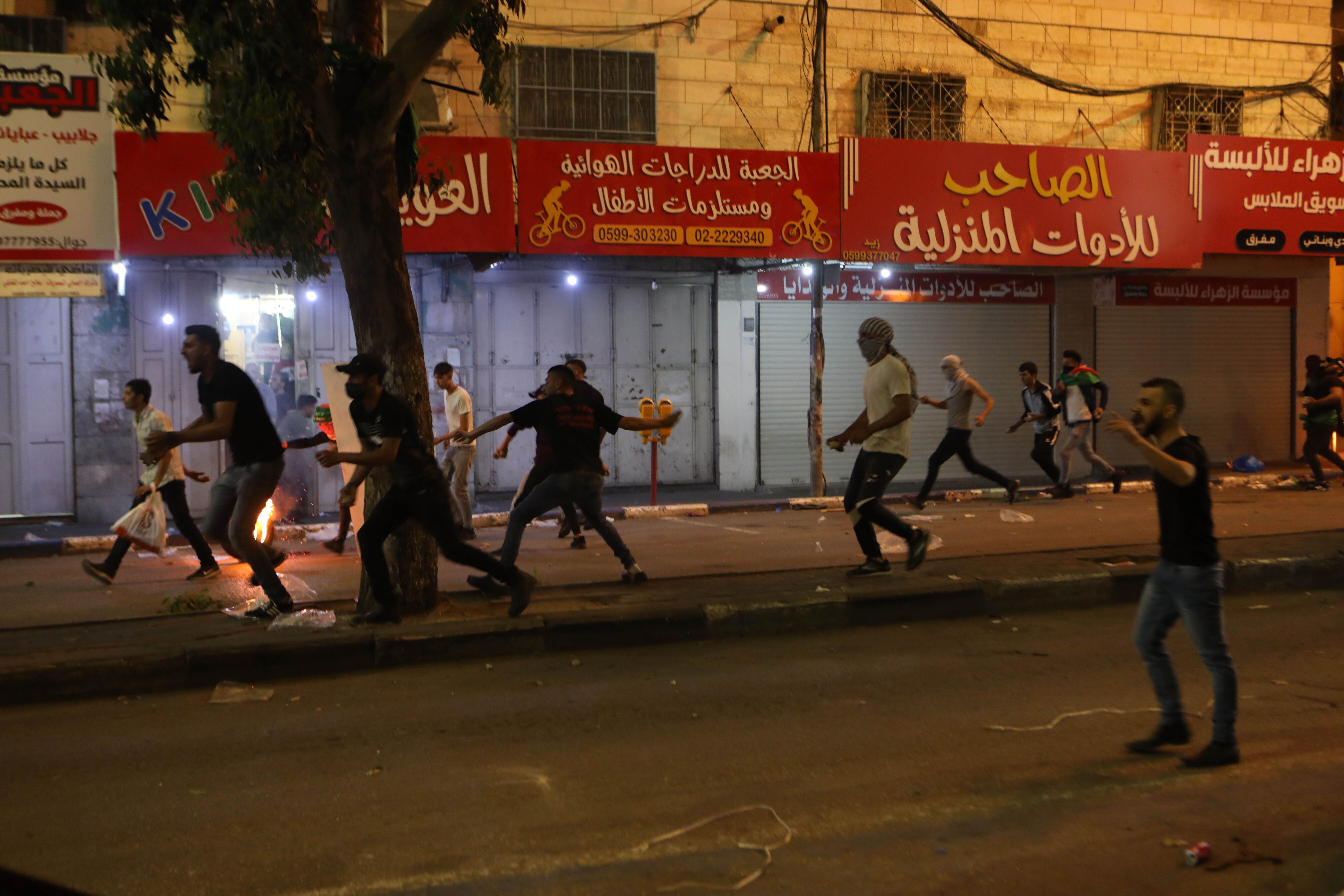 Palestinians respond to an Israeli intervention during a protest against attacks by Israeli police with tear gas, rubber bullets and stun grenades on Palestinians at Masjid al-Aqsa, in Nablus, West Bank early on May 11. Photo: Mamoun Wazwaz/Anadolu Agency via Getty Images