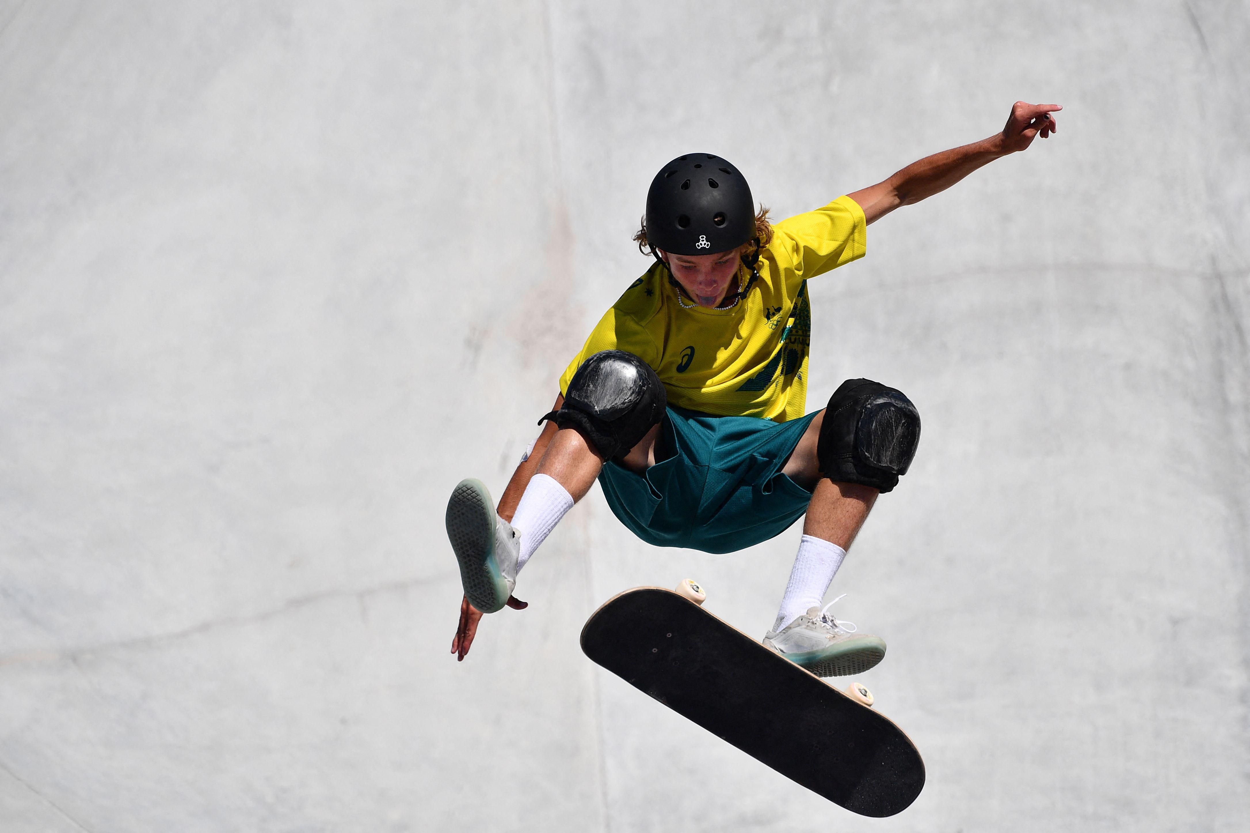 Australia's Keegan Palmer competes in the last skateboarding final — the men's park, which he won, at Ariake Sports Park Skateboarding in Tokyo on August .5. Brazil's Pedro Barros won silver and American Cory Juneau took bronze. Photo: Loic Venance/AFP via Getty Images