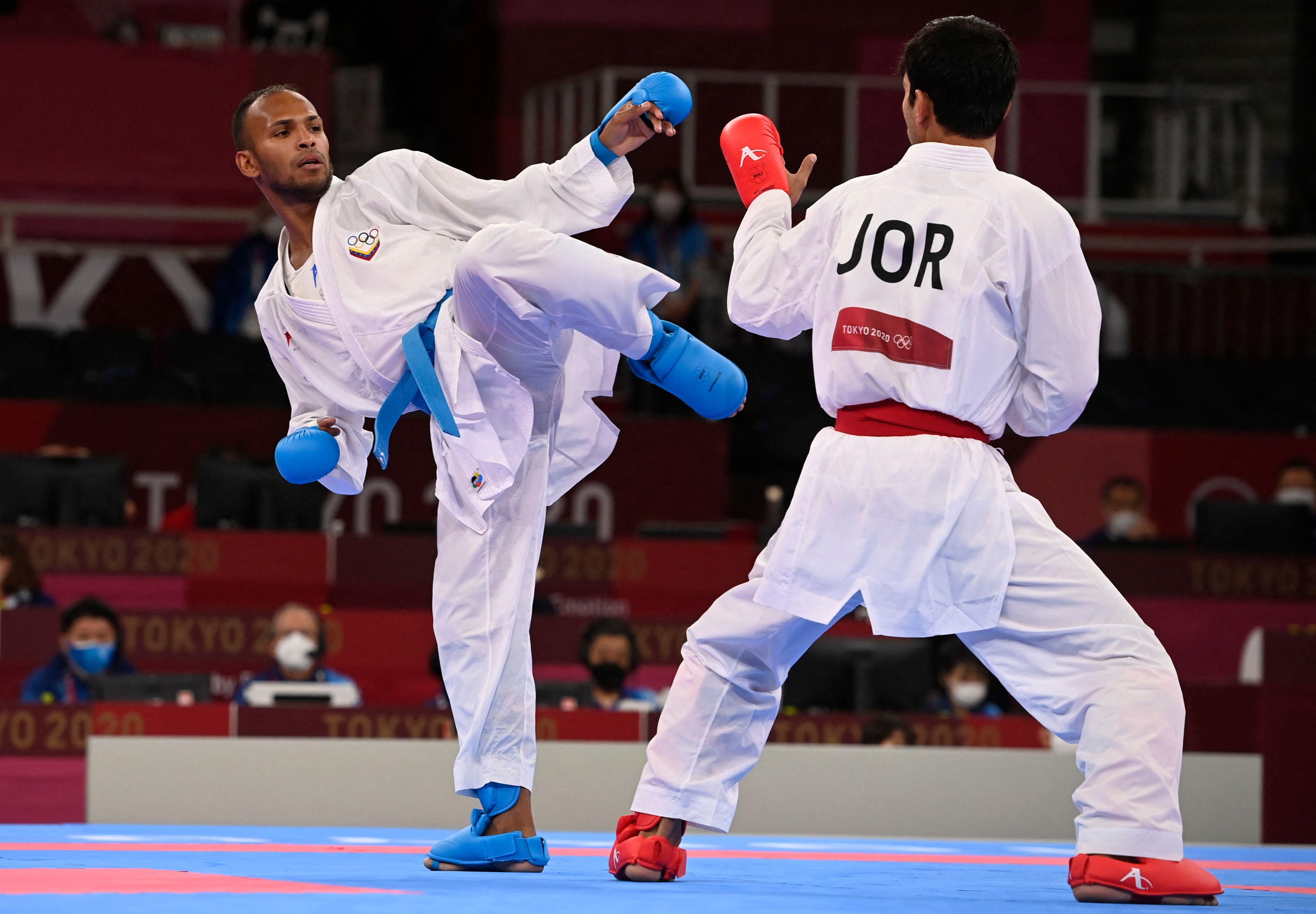 Jordan's Abdel Rahman Almasatfa (R) competes against Venezuela's Andres Eduardo Madera Delgado in the men's kumite -67kg elimination round of the karate competition duringat the Nippon Budokan in Tokyo on Aug. 5. Photo: Alexander Nemenov/AFP via Getty Images