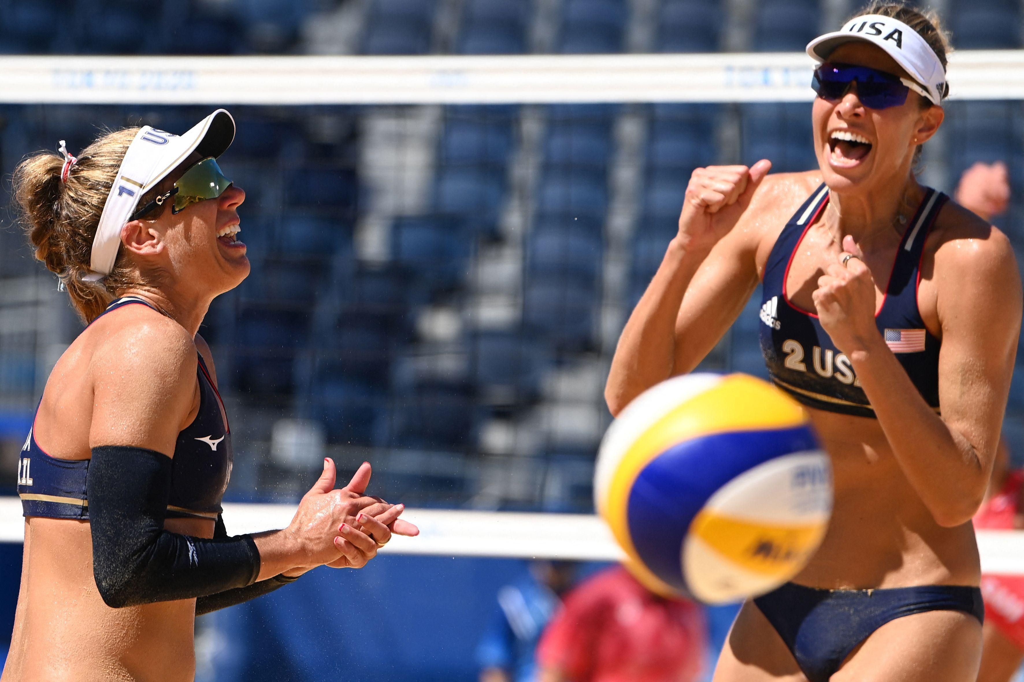 Americans April Ross and Alix Klineman react in their women's beach volleyball semifinal match with Switzerland at Shiokaze Park in Tokyo, which they went on to win on Aug. 5. They're now guaranteed to earn at least an Olympic silver medal. Photo: Martin Bernetti/AFP via Getty Images