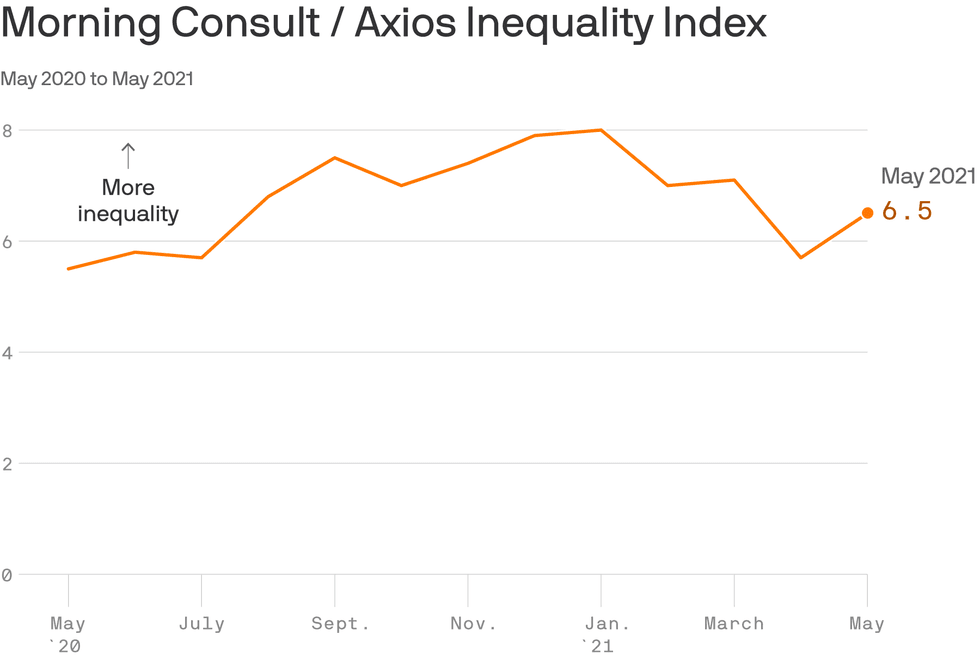What it means: "We had unprecedented stimulus in December and then again in March and over that period of time we’ve seen the Morning Consult/Axios Inequality Index decrease ... but we’re now at a point in May where the sugar high from the second and third stimulus has worn off," Morning Consult chief economist John Leer tells me in an interview.
