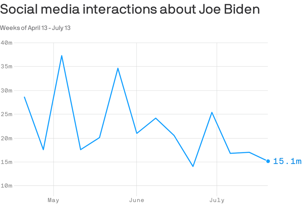 Even after emerging from his Delaware basement, Joe Biden has consumed less and less of the national conversation while his polling lead over President Trump has swelled, according to data from NewsWhip provided exclusively to Axios.