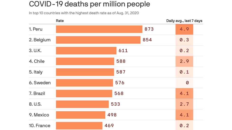 Why it matters: Peru and Belgium illustrate the divergence between the world's two hardest-hit regions since the eye of the storm shifted from Europe to Latin America in the spring.