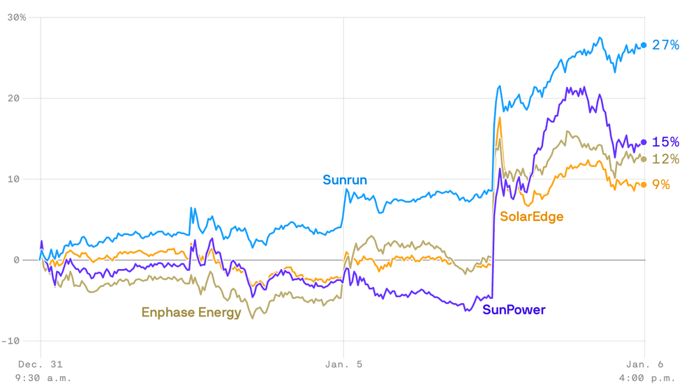 Driving the news: Yes, stocks move around for lots of reasons. But Democratic wins in Georgia's Senate races — giving Democrats control of both ends of Pennsylvania Ave. — probably propelled solar shares.