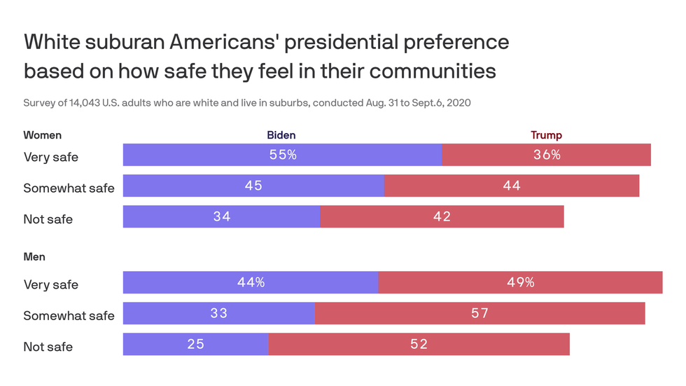 By the numbers: White suburban women who feel "very safe" prefer Biden by about a 20 percentage-point margin, the survey finds. Biden's lead disappears among white suburban women who say they feel only "somewhat safe."