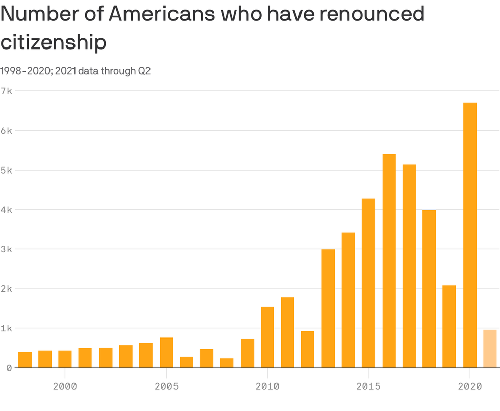- The State Department is tight-lipped about the numbers and what they mean. "Since embassies or websites offer appointments on a first-come, first-served basis as local conditions permit, we do not track 'pent-up demand' for U.S. citizenship renunciations," an official told Axios.