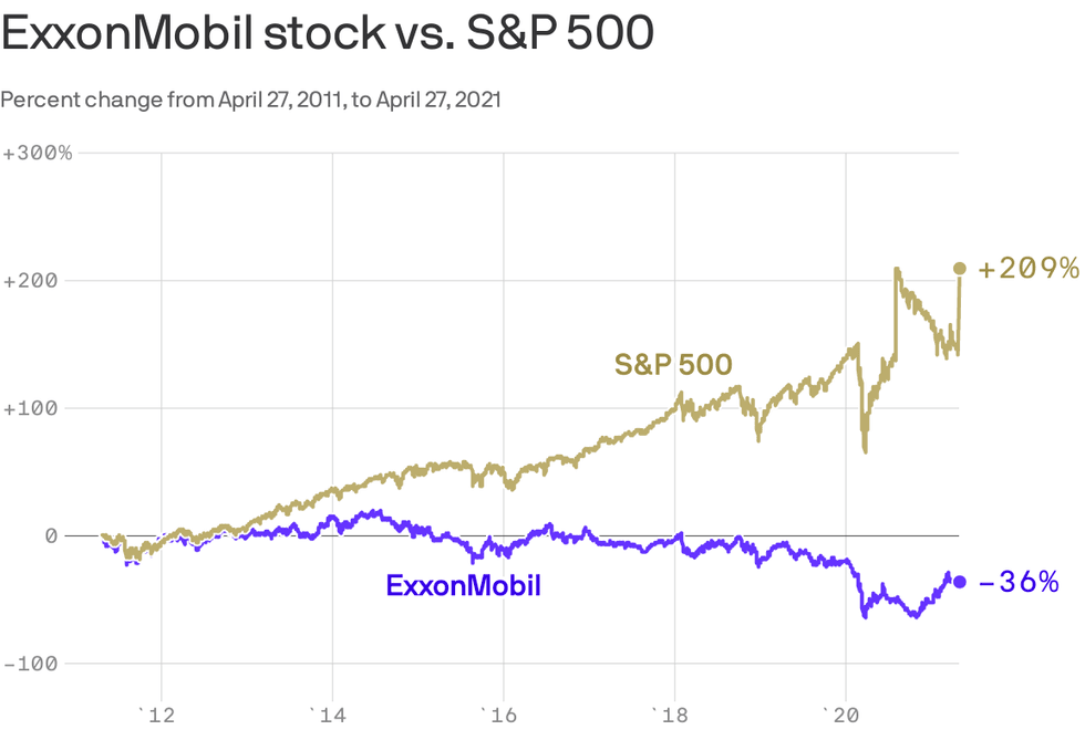 What they're saying: Engine No. 1, in an 81-page presentation posted this week, says Exxon has "significantly underperformed and has failed to adjust its strategy to enhance long-term value."