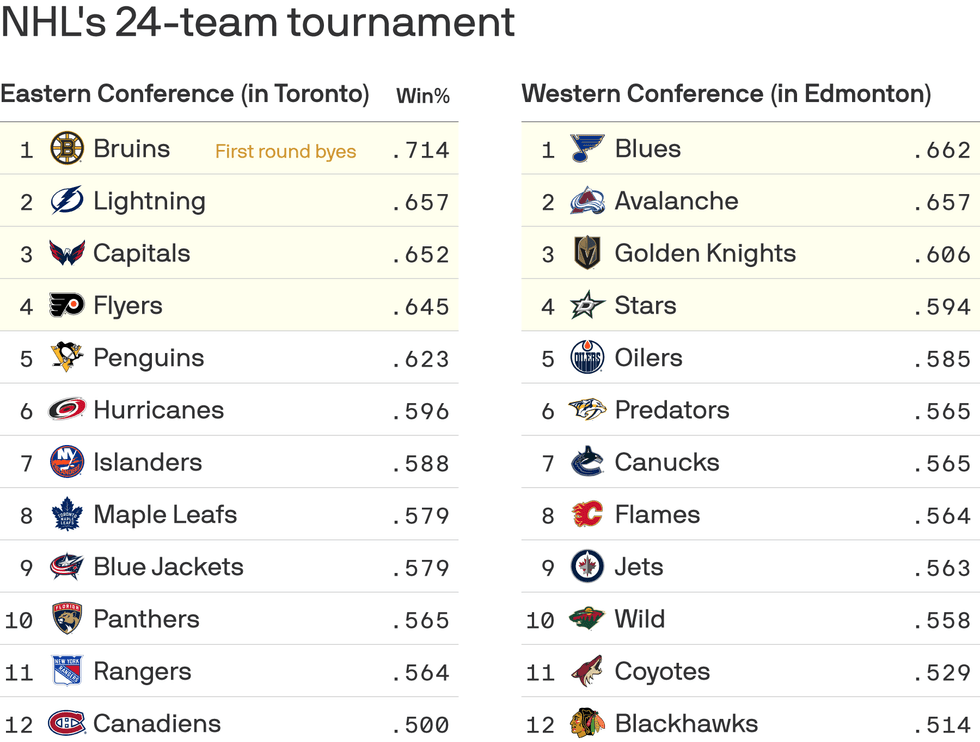 The NHL's race to the Stanley Cup begins Saturday, with 24 teams split between two bubbles — one centered around the Toronto Maple Leafs' Scotiabank Arena, the other around the Edmonton Oilers' Rogers Place.