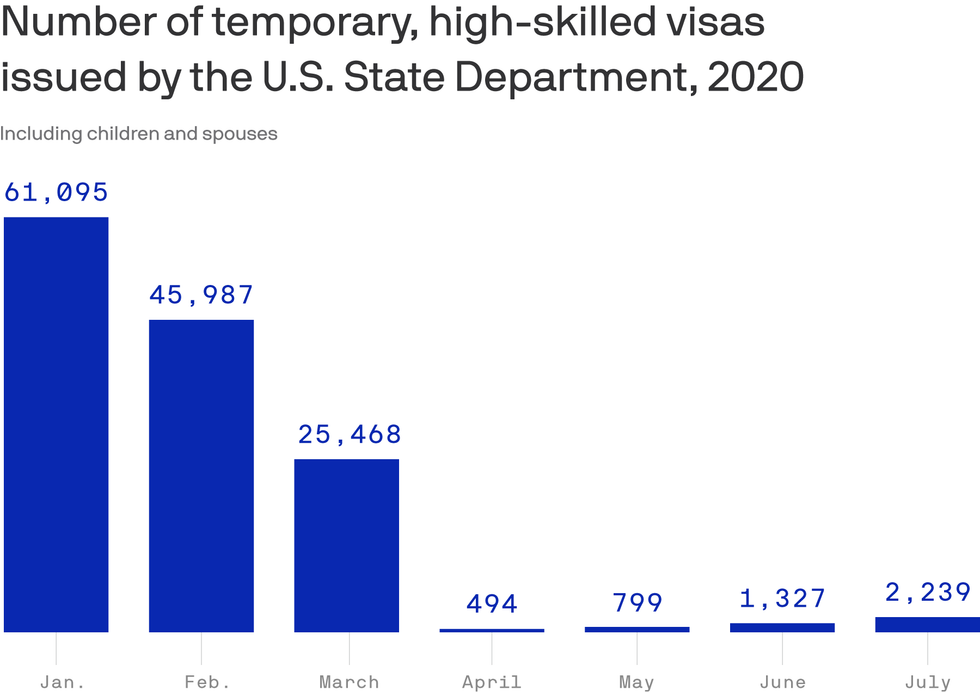 - Temporary, high-skilled visas rose from April to around 2,200 in July — still a far cry from the nearly 61,000 issued last July.