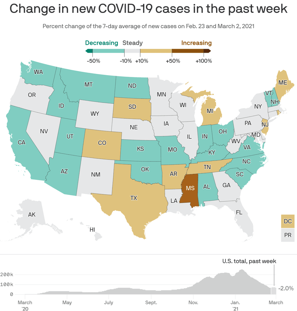 The big picture: Nationwide, progress against the virus has stalled. And some states are ditching their most important public safety measures even as their outbreaks are getting worse.