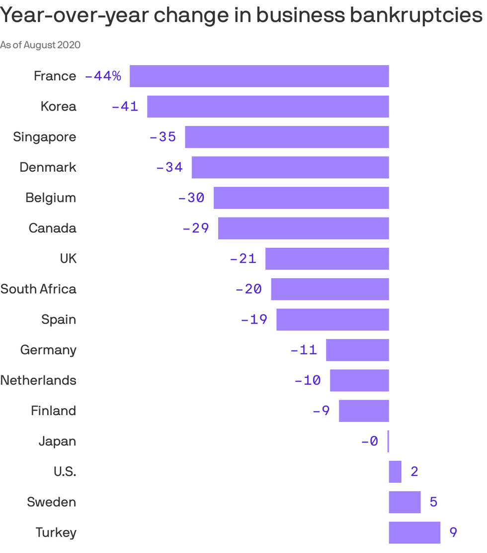The number of business bankruptcies and insolvencies in most countries has declined this year through the coronavirus pandemic as the world is seeing far fewer bankruptcies than it did in 2019.