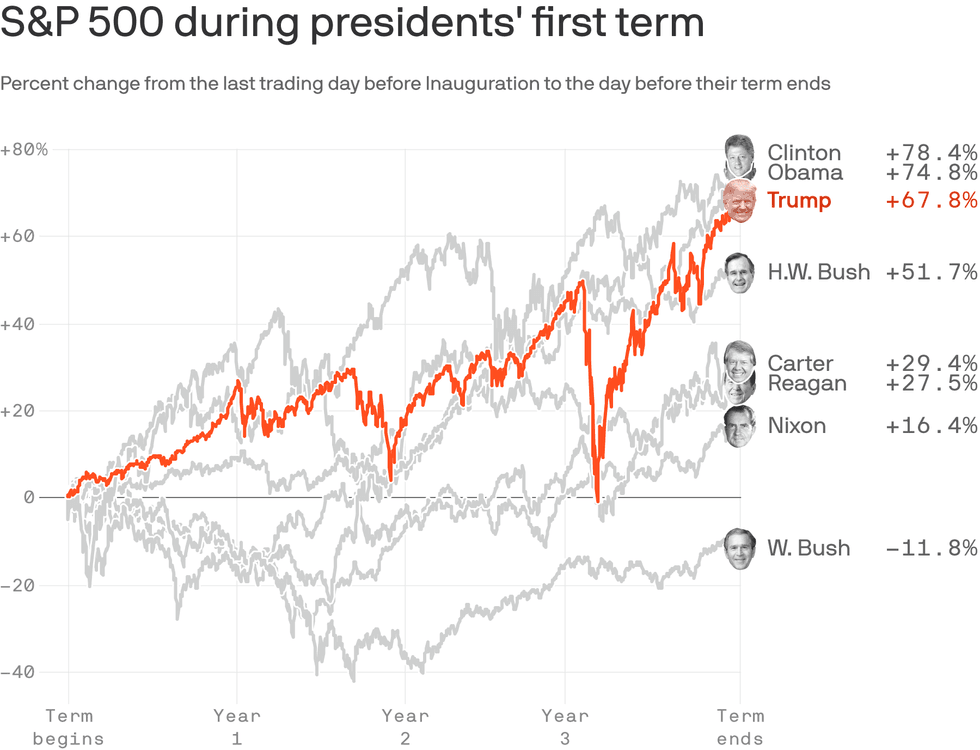 Between the lines: Obama inherited a financial crisis and was thus starting from a much lower level than was Trump, who inherited a bull market. During Obama's first term, both the S&P 500 and Dow Jones Industrial Average had higher percentage gains than they did under Trump, although the Nasdaq rose more during Trump's first term.