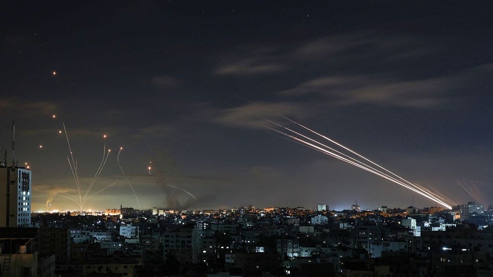 The Israeli Iron Dome missile defense system (L) intercepts rockets (R) fired by Hamas from Gaza toward Israel early on May 16. Photo: Mohammed Abed/AFP via Getty Images