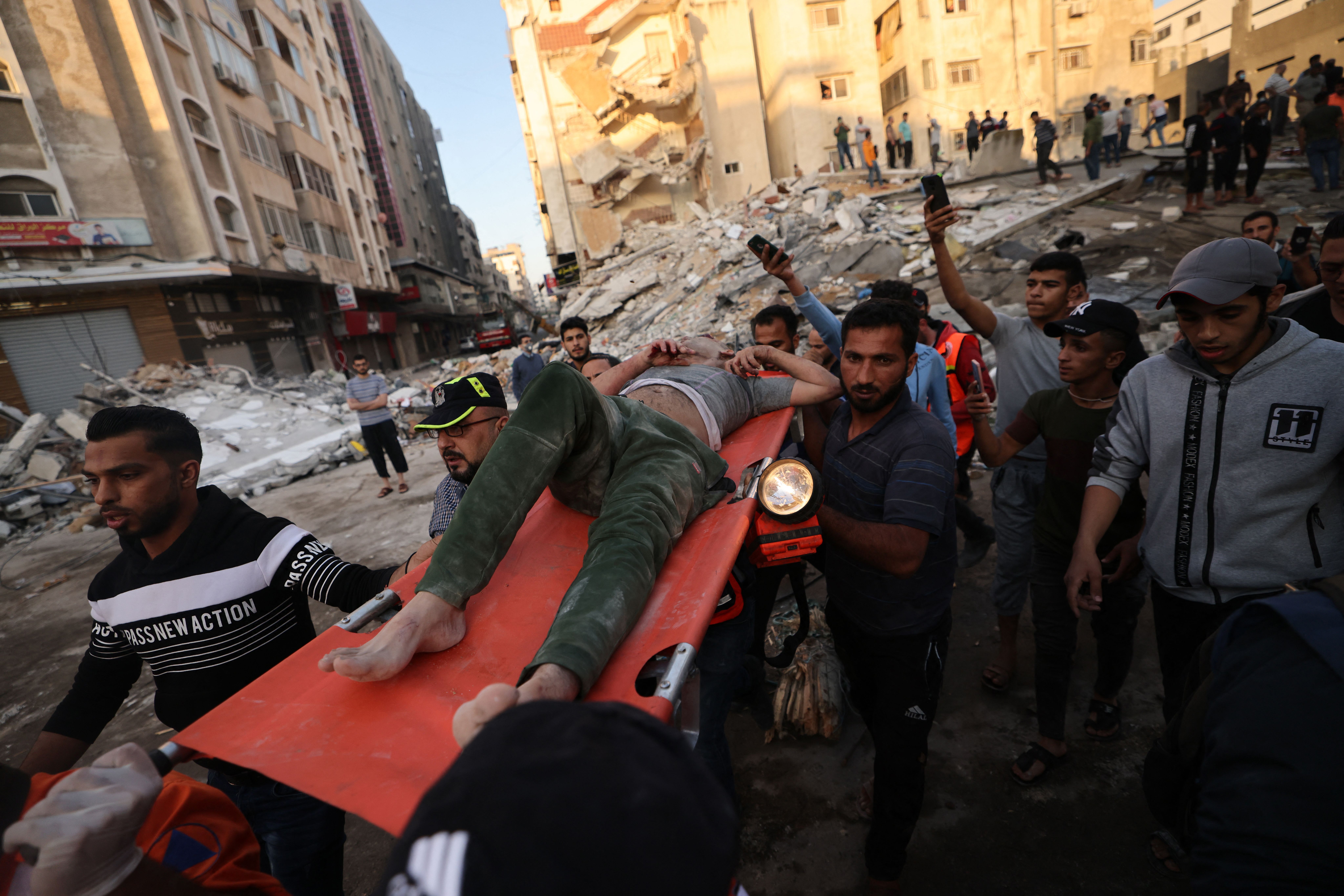 Palestinians carry one of survivors from under the rubble of a building, after it was struck by Israeli strikes, in Gaza, May 16. Photo: Mohammed Abed/AFP via Getty Images
