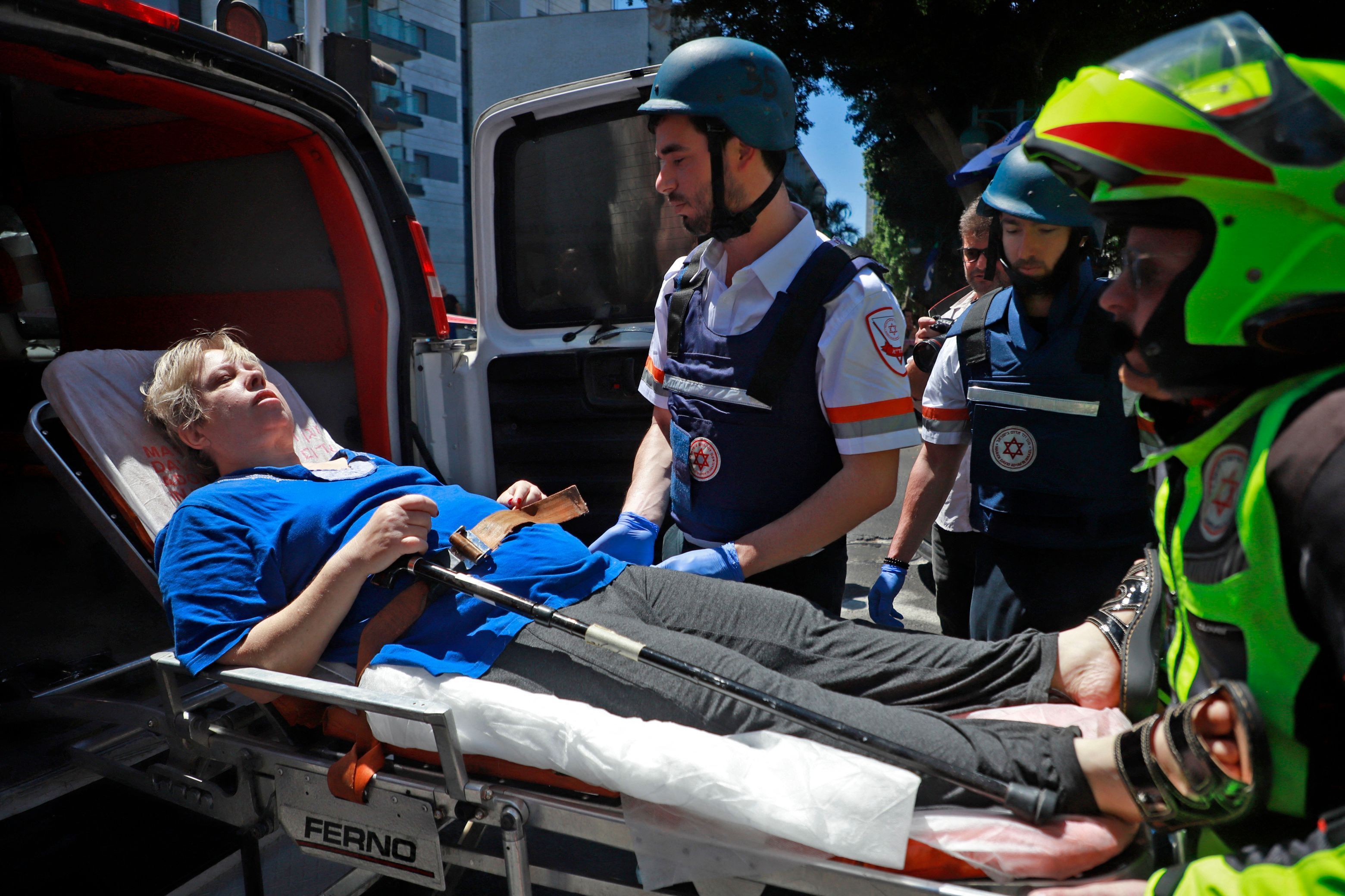 Members of Israel's security and emergency services transport an injured woman from a site hit by a rocket in Ramat Gan, near the coastal city of Tel Aviv, on May 15. Photo: Oren Ziv/AFP via Getty Images