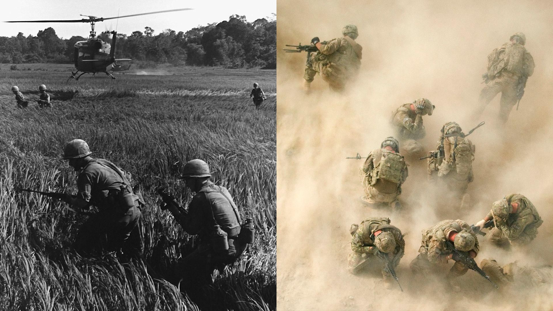 Left: Members of the 1st Division Infantry look for Viet Cong fighters during the Vietnam War. Right: U.S. soldiers gather as their wounded comrades are airlifted by a Medevac helicopter in Afghanistan in 2011. Photos: (left) Corbis Historical via Getty Images; (right) Johannes Eisele/AFP via Getty Images
