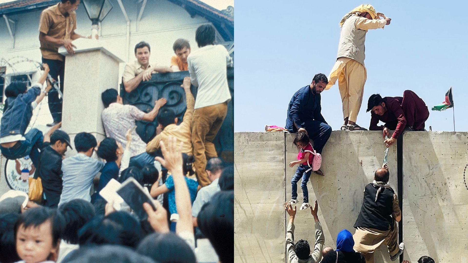 Left: Desperate South Vietnamese citizens try to scale the walls of the American Embassy in 1975. Right: Afghans rush to the Hamid Karzai International Airport as they try to flee Kabul. Photos: (left) Nik Wheeler/Corbis via Getty Images; (right) Haroon Sabawoon/Anadolu Agency via Getty Images