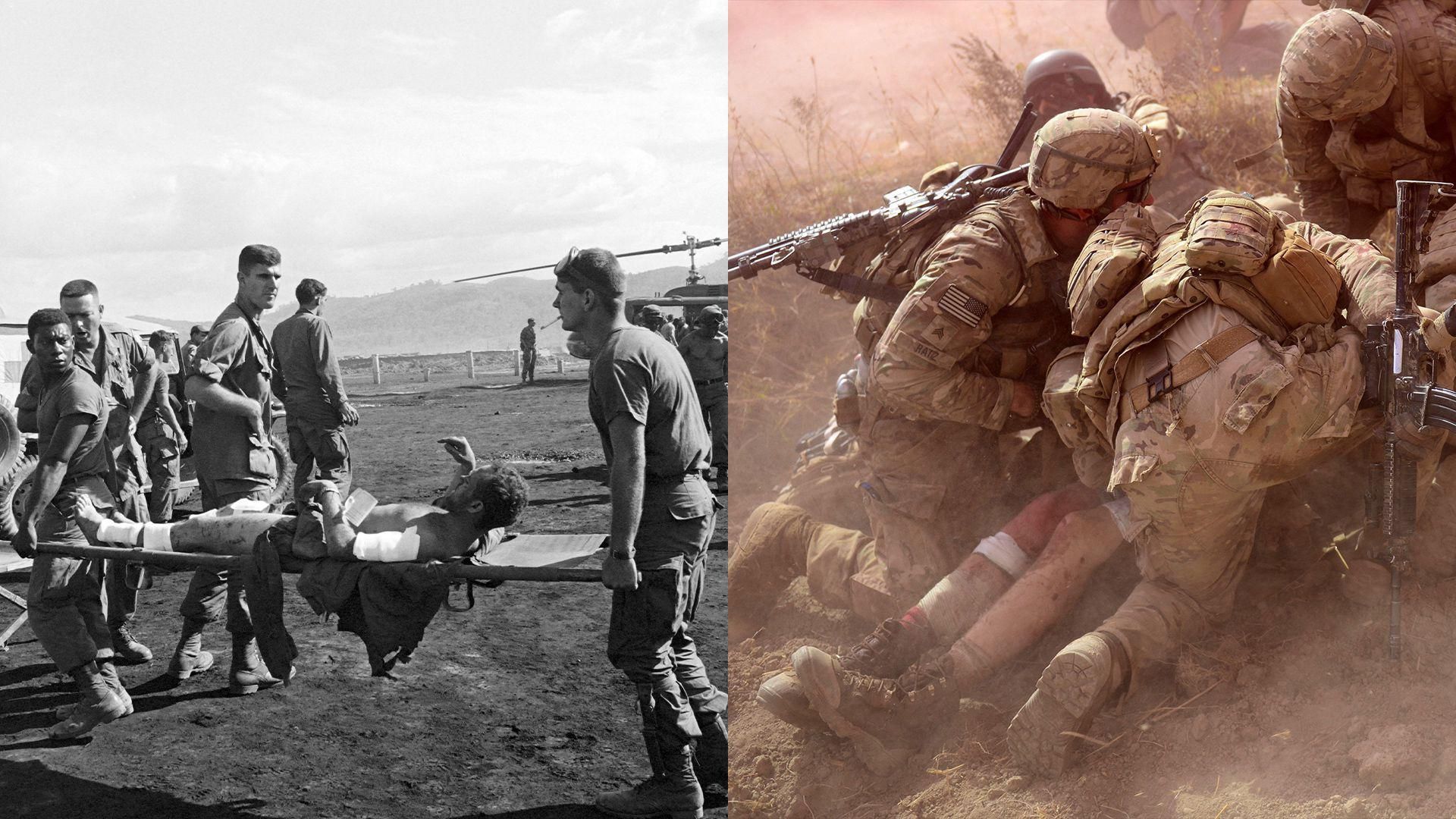 Left: Wounded U.S. soldiers are evacuated by helicopter after a Vietnam War battle in 1967. Right: U.S. Army soldiers protect an injured comrade from dust and smoke flares after an Improvised Explosive Device (IED) blast in 2012. Photos: (left) Francois Mazure/AFP via Getty Images; (right) Munir Uz Zaman/AFP via Getty Images