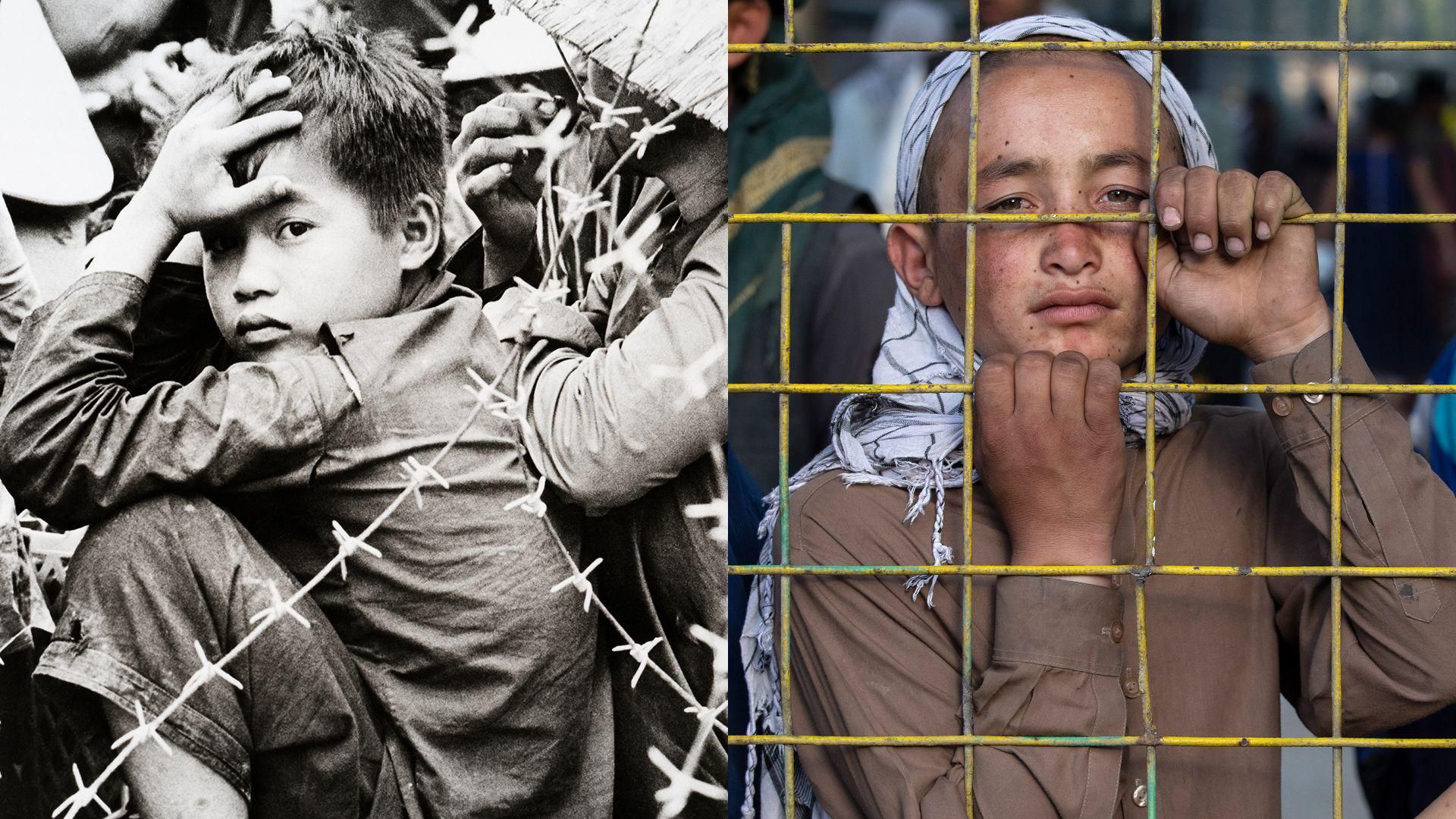 Left: A young Vietnamese boy arrested during an anti-government demonstration in Danang, South Vietnam, stares out from behind barbed wire. Right: Displaced Afghans look through a fence in August 2021. Photos: (left) Nik Wheeler/Corbis via Getty Images; (right) Paula Bronstein/Getty Images