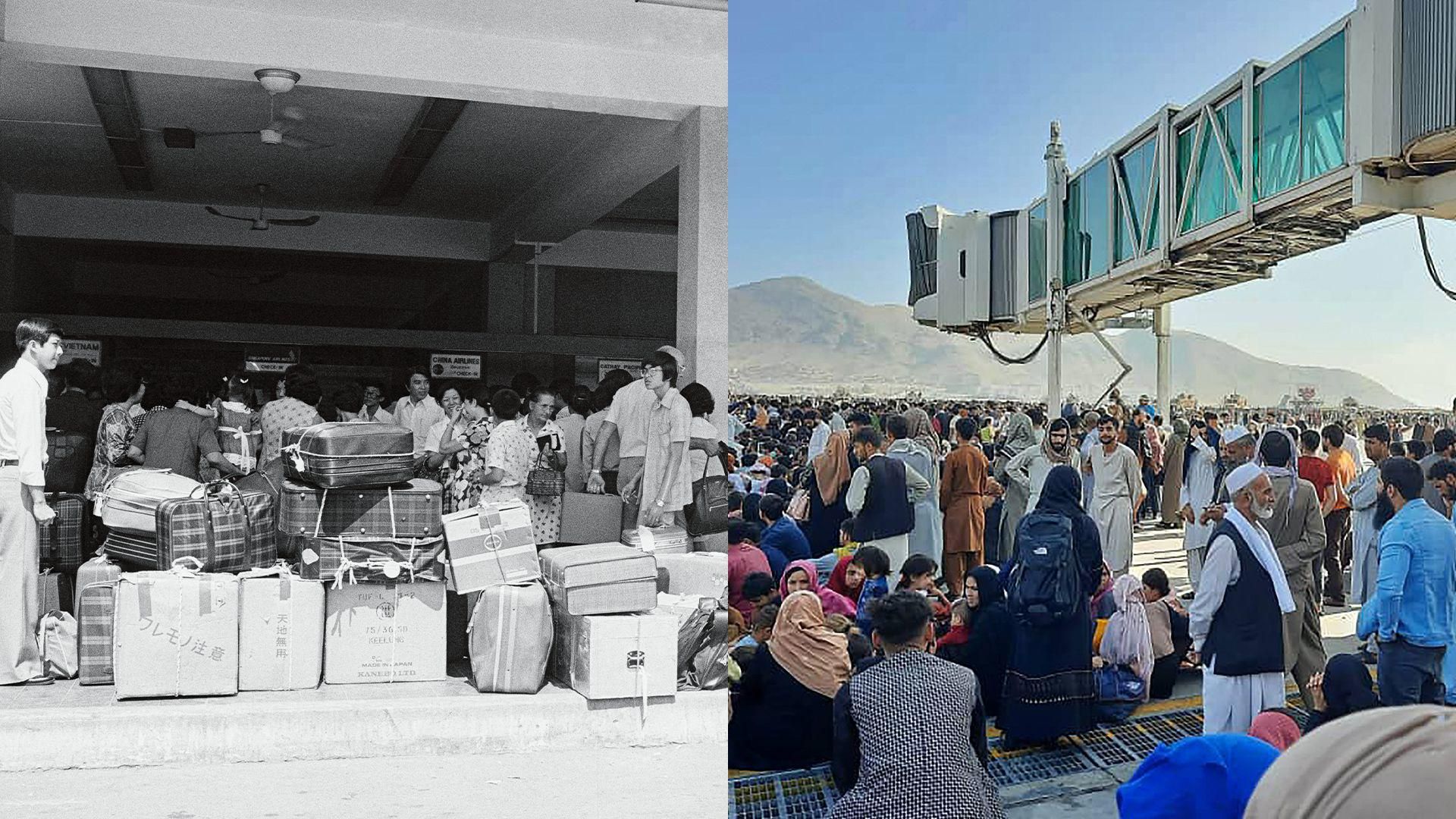 Left: Long lines of people hurry to get exit visas and air tickets out of Vietnam. Right: Afghans crowd at the tarmac of the Kabul airport. Photos: (left) Bettmann via Getty Images; (right) AFP via Getty Images