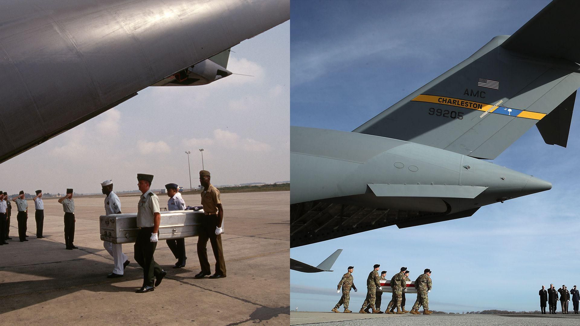 Left: Soldiers salute as remains of American GIs are carried to a plane in Hanoi. Right: A U.S. Army team carries the remains of a U.S. Army Sgt. 1st Class who was killed in Afghanistan in 2019. Photos: (left) Steve Raymer/Corbis via Getty Images; (right) Mark Wilson/Getty Images