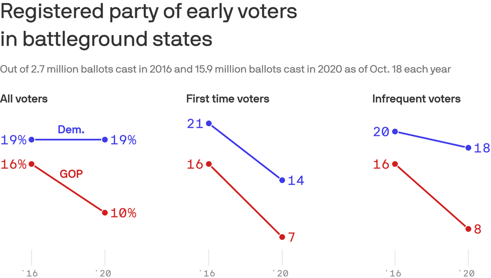 Details: So far, first-time and infrequent Democratic voters are outpacing registered Republicans with larger margins than in 2016, according to data from TargetSmart, a Democratic firm.