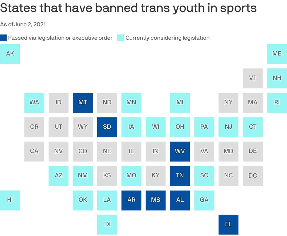 Eight states this year have banned transgender kids from playing on sports teams that match their gender identity, per data from the ACLU and bipartisan LGBTQ advocacy group Freedom For All Americans.